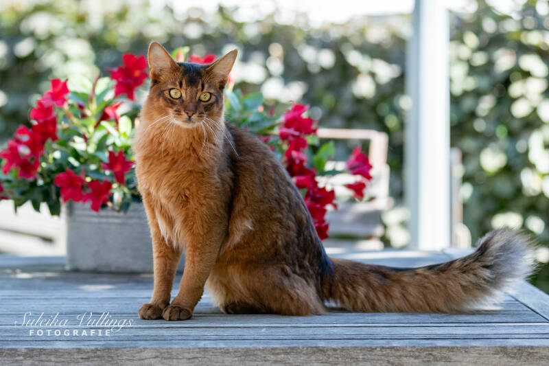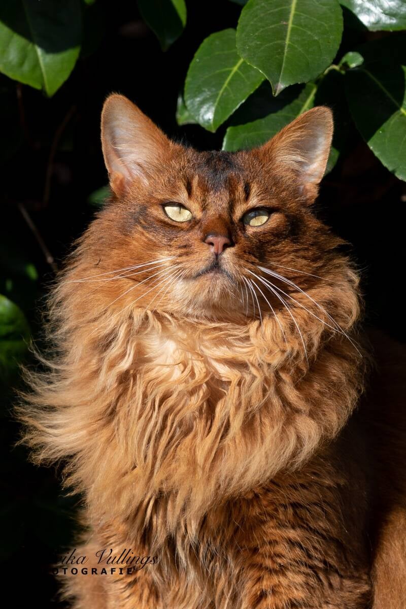 Altun is geboren in Zweden bij Katinka Pålsson. Het was nog een enorme toestand om hem in Nederland te krijgen in corona tijd, maar in juli 2020 was het dan eindelijk zover. Eenmaal hier aangekomen na een reis op de fiets, de trein, met de boot en de auto dachten we dat hij alles wel gezien had. Tot hij onze honden tegen kwam. Het fenomeen hond had hij duidelijk nog nooit gezien in zijn korte leven. Hij vond ze werkelijk doodeng en het heeft een paar maanden geduurd voordat hij echt helemaal aan ze gewend was. Nu loopt hij er gelukkig tussen alsof het niks is, dus het is helemaal goed gekomen. Hij is een enorme knuffelkont. Het liefst plakt hij de hele dag tegen je aan. Ook luistert hij heel goed naar z'n naam. We hoeven hem maar één keer te roepen en hij komt direct naar je toe. Hij vind het heerlijk om lekker de hele dag in de tuin rond te struinen, maar kan er ook erg van genieten om lekker binnen in een hangmandje van de krabpaal te liggen.